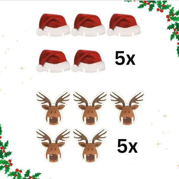 Opakowanie zawiera 10 kart (5x czapka Mikołaja i 5x jeleń) o szerokości 6 cm i wysokości 3,7 cm.
