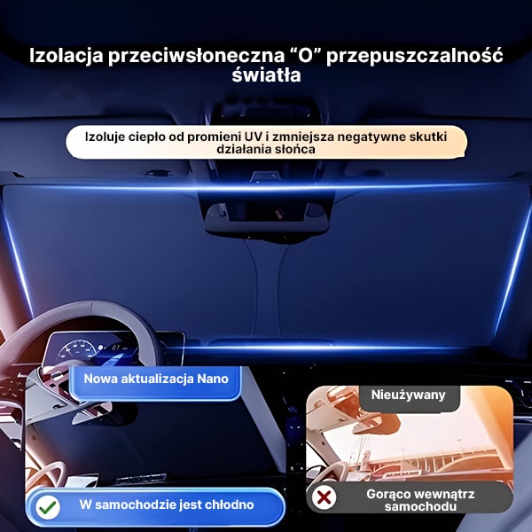 Upewnij się, że wnętrze samochodu pozostaje chłodniejsze, chroniąc deskę rozdzielczą, siedzenia i kierownicę przed palącymi promieniami słońca.