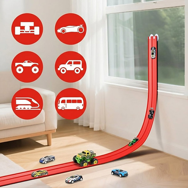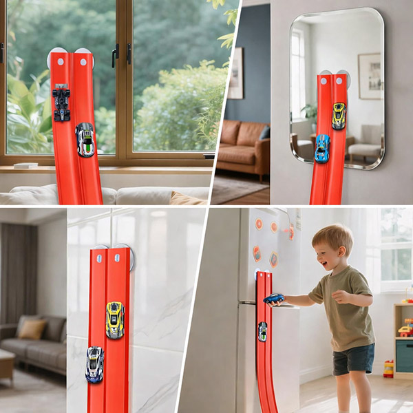Mocowanie na przyssawki pozwala dzieciom i rodzicom szybko zmieniać kąty i układy, dzięki czemu tor można budować od nowa wielokrotnie bez narzędzi i skomplikowanego montażu.