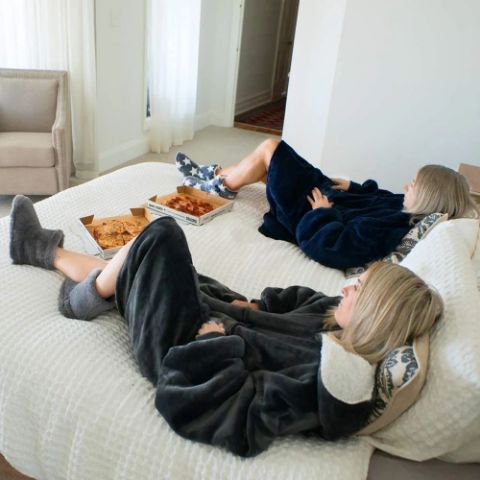 HOODZIE ma długość aż do kolan – jest to bluza z kapturem i koc w jednym, dzięki czemu zapewni Ci przyjemne ciepło podczas oglądania telewizji, czytania czy popołudniowego relaksu.