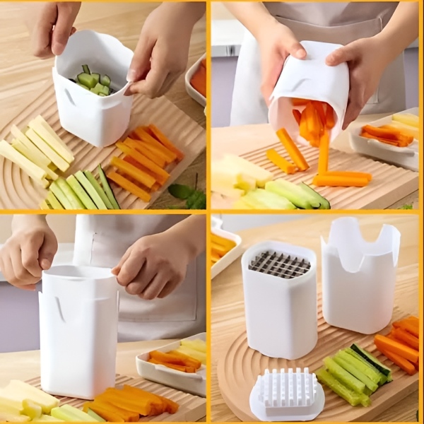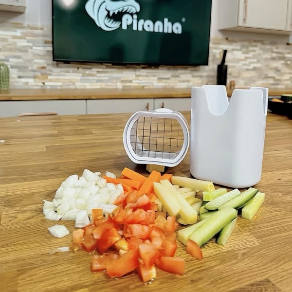 Narzędzie kuchenne CHOPZY to nie tylko do frytek; to wszechstronna krajalnica do warzyw, która radzi sobie z różnymi składnikami, takimi jak marchew, ogórek czy cebula, ułatwiając przygotowywanie posiłków.